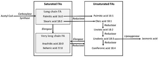 A change in fatty acid (FA) profile is one important cold-induced effect in plants [7,8]. FAs are integral components of cellular membranes in amphiphilic lipids and influence the integrity of all cellular membranes [9,10]. FAs are formed through de nova synthesis, which forms long chain saturated FAs (i.e., palmitic and stearic acid) from Acetyl-CoA via carboxylase and FA synthase [11]. Unsaturated FAs are created via desaturases while very long chain FAs are formed via elongases (Figure 1). FA desaturation increases postharvest, with low needle abscission resistant genotypes shows a decline in unsaturated fatty acids and loss of membrane integrity sooner than high NRD clones [12]. This could be related to the stability of membranes prior to harvest or the action of a fatty acid signaling molecule. In other frost-resistant plants, it has been observed that unsaturated FAs have been known to increase to help maintain membrane integrity for proper protein function to survive cold [13].