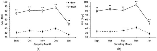 Changes in (a) needle abscission commencement (NAC) and (b) peak needle abscission (PNA) in low and high NAR balsam fir genotypes over time. Data points are displayed as mean ± standard error as calculated from 10 branches each. The ** indicates 1% significance between genotypes at each month.