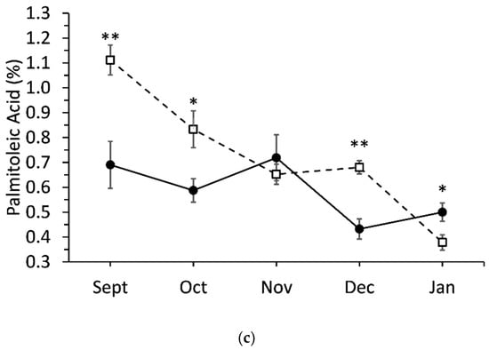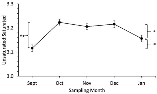 Balsam fir needles had an unsaturated: saturated FA ratio of 3.12 in September. There was a small but statistically significant (p < 0.001) shift towards accumulation of unsaturated FAs in October, November, and December (Figure 3). The unsaturated: saturated ratio in January was not significantly higher than September, nor lower than October, November, and December.