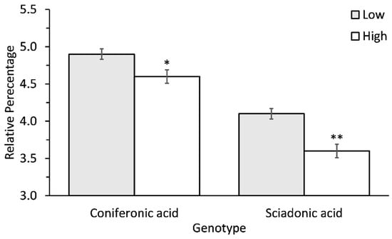 Fatty acid relative percentages in balsam fir needles from low and high needle abscission resistance genotypes of balsam fir collected initially in September to establish a baseline fatty acid profile at the beginning of the experiment. Relative percentages are displayed as mean ± standard error as calculated from 20 branches. An * indicates 1–5% significance while ** indicates less than 1% significance.