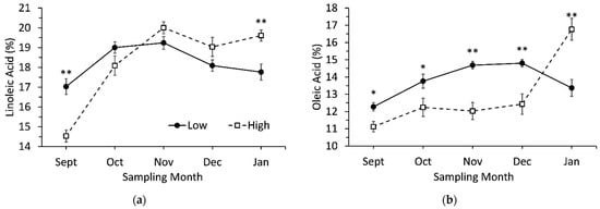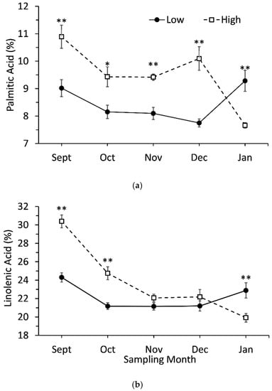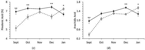 Interactive effects between balsam fir genotype (low and high needle abscission resistance) and sample collection date for (a) linoleic acid, (b) oleic acid, (c) pinolenic acid, and (d) and arachidic acid. Each data point represents a mean ± standard error as calculated from of 10 branches. The * indicated 1% to 5% significance and the ** indicates less than 1% significance between genotypes at any month.