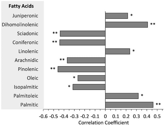 Significant correlation coefficients of fatty acids compared to needle retention in balsam fir. An * indicates 1−5% significance and ** indicates less than 1% significance. n = 100 for each.