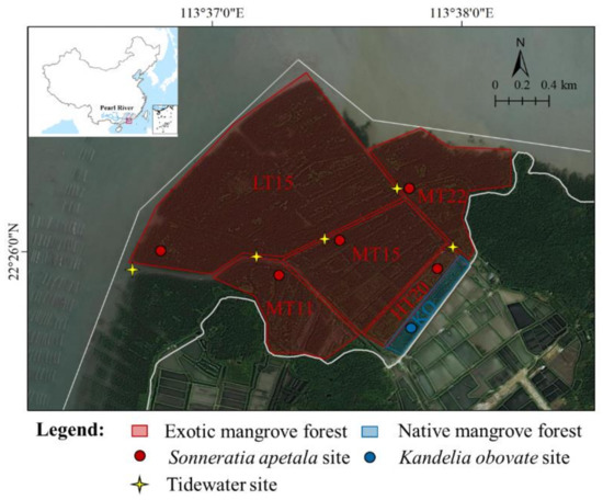 The Qi’ao mangrove area, part of the Qi’ao–Dangan Island provincial-level Natural Reserve, is located in a suburb of Zhuhai City (south China) (Figure 1). Qi’ao Island has a subtropical maritime monsoon climate characterized by 90% of the total annual rainfall occurring in the typhoon season (April–October) and an average air temperature ranging from 15 °C to 28.5 °C over the year. The Qi’ao mangrove soil is mostly clayed silt and silty clay [28]. Qi’ao Island is located in the Pearl River Estuary, and the surrounding coastal waters are suffering from severe eutrophication [29]. Since 1998, SA of Bangladeshi origin has been introduced to control the invasion of Spartina alterniflora, forming the largest continuous exotic mangrove forests in China (~2 km2) [30]. KO is the major native mangrove species, with contributing 4.2% of the area on Qi’ao Island.