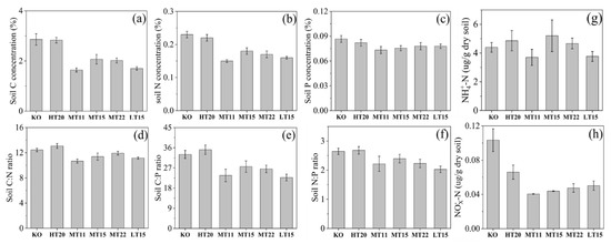 The soil was slightly acidic (Ph: 6.8 ± 0.2) and slightly saline (salinity: 1.9–5.4‰). Soil C concentrations varied from 1.22% to 4.28%, soil N concentrations ranged from 0.13% to 0.32%, and soil P concentrations were relatively uniform, varying from 0.04% to 0.10% (Figure 2a–c). Significantly higher C and N concentrations were observed at the high tide sites (KO and HT20) (p < 0.001). However, no significant differences were observed between the other sites.