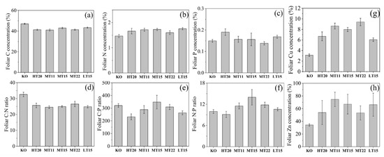 Foliar concentrations of (a) C, (b) N, (c) P, (g) Cu and (h) Zn and stoichiometric ratios of (d) C:N, (e) C:P and (f) N:P in the Qi’ao mangrove forest.