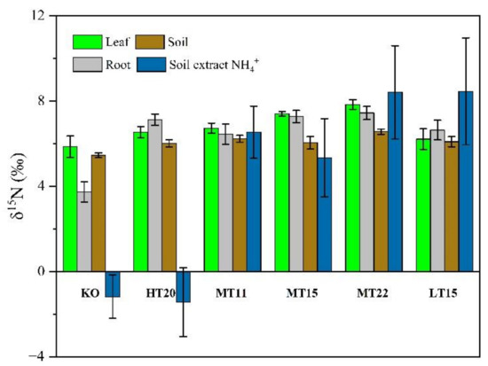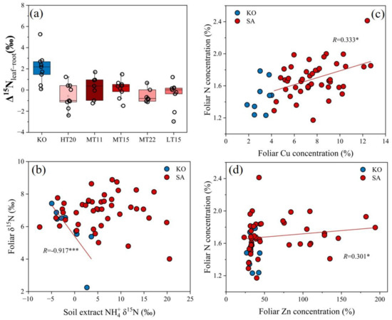 Further, foliar δ15N is an indicator of available N sources (e.g., NH4+, NO3−, organic N) that vary in their amounts and δ15N. Leaf–root differences in δ15N (Δ15Nleaf–root) could potentially give a hint of the different N source preferences between NH4+ and NO3− [23], two major forms of N that can be utilized by plants, due to differences in the tissue-specific location of primary N assimilation [52,53]. The assimilation of NH4+ usually occurs immediately in the roots, so there is little intra-plant variation in δ15N as a result of a single root-assimilation event [23,54]. On the contrary, NO3− can be assimilated in both roots and shoots [23,55]. Considering the fractionation against the heavier isotope during root NO3− assimilation, the remainder of the unassimilated root NO3− should be enriched in δ15N. Once the enriched NO3− pool is transported to the leaf for assimilation, the leaf would become enriched in δ15N relative to root [56], leading to a significant Δ15Nleaf–root. The KO plants had relatively higher values of Δ15Nleaf–root of 2.11‰ ± 0.50‰ (n = 9), suggesting that KO preferred NO3−, while the relatively low Δ15Nleaf–root for SA of 0.12‰ ± 0.25‰ suggested a preference for NH4+ in SA (Figure 5a). Despite the low NO3−-N concentrations in the soil extracts (NO3−: 0.66 ± 0.08 μmol/L), KO could still mainly uptake soil NO3−, since low NO3−-N concentrations up to 0.3–9 μmol/L can induce the uptake of NO3− [50].
