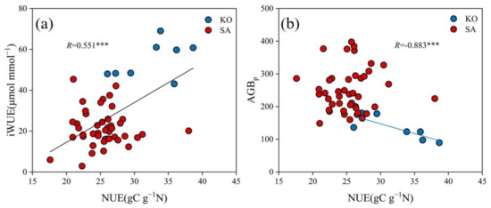 The relationships between NUE and iWUE (a), and NUE and AGBp (b) in two dominant mangrove species of the Qi’ao mangrove forest. KO: Kandelia obovate; SA: Sonneratia apetala; *** means p < 0.001; AGBp was derived from the published data in [31].