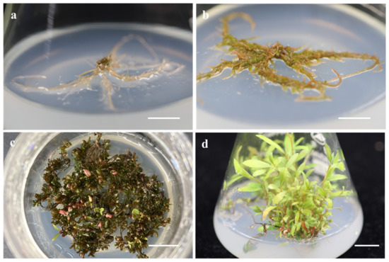 In vitro shoot induction and elongation from root explant of P. ussuriensis: (a) Root explants as starting material. (b) Shoot induction is in progress. (c) Accomplished shoot induction. (d) Accomplished shoot elongation. Bars = 1.0 cm.
