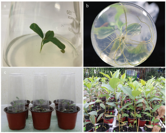 Healthy elongated shoots were separated from root explants and subcultured onto half-strength MS basal medium (pH 5.8) without any PGRs. The time and efficiency of rooting were recorded. The efficiency of rooting was calculated as (the number of rooted shoots/the number of total shoots). Seedlings with intact roots were transferred into 15 cm pots filled with a sterile soil-vermiculite-perlite mixture (1:1:1, v/v) and sealed with transparent plastic cups. Plants were acclimated for 4 weeks in a greenhouse at a temperature of 24 ± 1 °C and a relative humidity of 80%.