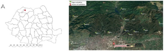 A network of experimental plots was established in the Northern part of Romania close to the city of Baia Mare (47°39′ N 23°34′ E), in the beech forest stands affected by industrial pollution. The sampling plots were located at a specific distance from the source of pollution to highlight the different degrees of damage to the stands due to air pollution (Figure 1). Previous studies, in which several stands located at different distances from the source of pollution were analyzed, were taken into consideration, and it was concluded that the distance of 2 km is the approximate distance at which the stands were affected by air pollution in varying degrees of intensity [13]. This distance can be influenced by the direction and intensity of prevailing winds [14]. Thus, twelve experimental plots were placed in the study area: five plots in the intensively polluted area, three plots in the moderately polluted area, and four plots in the unpolluted area.