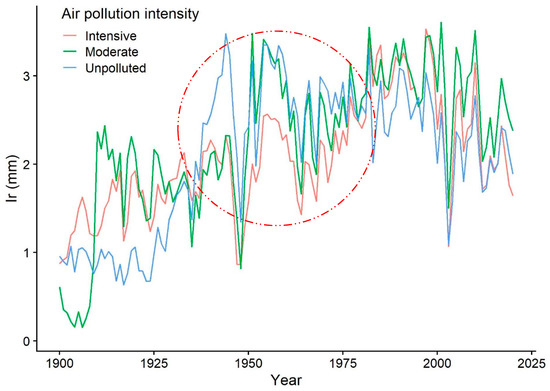From the analysis of the average radial growth presented in Figure 2, the beech trees located in the three areas studied (intensive, moderate, and unpolluted) show a relatively constant variation in growth throughout the analyzed period, differing only in the amplitude of their variation during certain time intervals. However, until 1930, the stands in the heavily polluted area had constantly higher radial growth than those in the unpolluted area; after this period, there was a reduction in the average radial growth of the trees in the intensively polluted area until around 1950. After this period, by around 1980, the stands in the area with intensive pollution show constantly lower radial growth compared to the stand in the unpolluted area, an interval which corresponds with high-intensity activity at the plant.