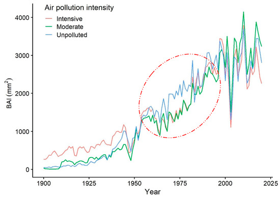 Mean BAI series of beech in Baia Mare region, presented in relation to the intensity of pollution (intensive-growth series in the area with intensive pollution; moderate-growth series in the area with moderate pollution; unpolluted-growth series in unpolluted area); dotted area—the period of maximum activity of the plant.
