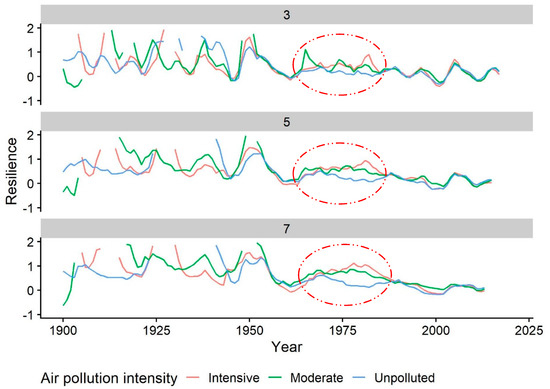 The degree of reduction and recovery of growth due to the influence of the local industrial air pollution was assessed through resilience, recovery, and resistance indices for every area affected by pollution (intensive, moderate, and unpolluted) for both average radial increment and BAI. These indices have been calculated for moving periods of 3, 5, and 7 years to capture possible differences when the influence of the pollution factors on the stands is considered.