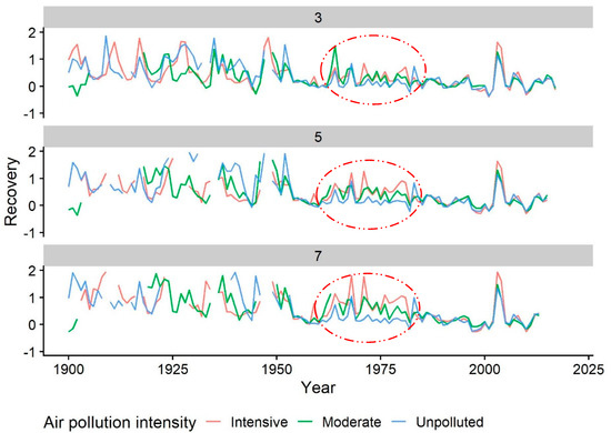 In the case of the recovery indices of BAI, as in the case of the resilience indices, the period between 1960–1990 is very prominent, especially in the case of the mobile periods of 5 and 7 years (Figure 5). An interesting aspect is that after 1950, for a short time, the trees showed low values of recovery rates, a phenomenon that is generated by more favorable environmental conditions. This may be because, at that time, the mining plant was in its full development, and new technologies that significantly reduced the pollution factors for a short period were introduced.