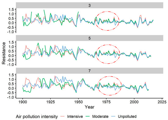 In the case of the resistance indices, the period in which the beech trees were affected by local pollution factors is not as clearly evident as in the cases of the resilience and recovery indices. However, differences in the variations of these indices in relation to the intensity of pollution in the period 1960–1990 can be observed (Figure 6).
