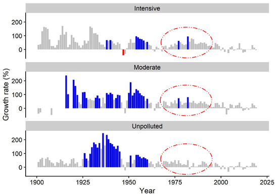 In the case of the average BAI series, the variation of the characteristic years is random until around 1970 (Figure 7). Analyzing the period when the trees were affected by local pollution (1960–1990), we observed high amplitude for these years for trees in the intensively polluted regions. In the case of the trees located in the moderately polluted region, this amplitude is lower, and in the case of the unpolluted area trees, the variation of the characteristic years of pollution decreases after 1950, a sign that these areas were not affected by pollution. After 1990, the variation of the characteristic years follows the same trend, regardless of the area affected by pollution, due to the significant reduction of activity at the mining plant and the resulting decrease in the pollution factors. Hence, the trees resumed almost normal auxological activity.