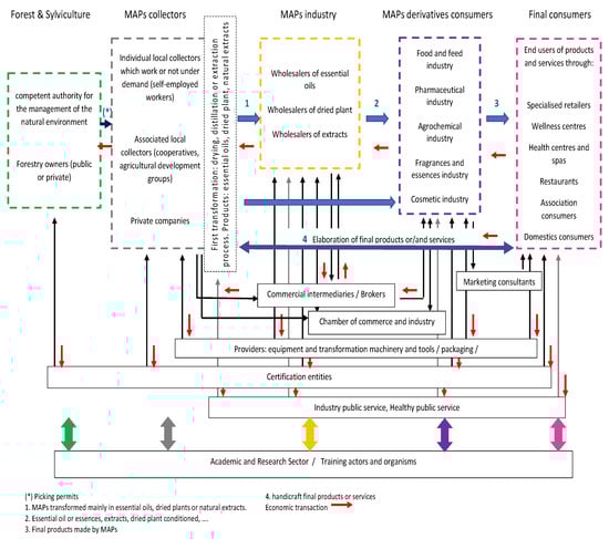 As illustrated in Figure 1, MAP commercialisation involves a complex network of activities starting from wild plant harvesting, first transformation, processing, packaging, and commercialisation to final consumers. Several stakeholders are involved in the MAPs supply chain. The presence of various stakeholders and many intermediaries can reduce transparency and put coordination between actors at risk. Collectors were recognised as the most important element in the supply chain, harvesting vegetable material from forest areas (public or private). This group includes the local population (self-employed workers), organised into cooperatives or working independently, agricultural development groups, and private companies. These collectors often carry out the first transformation (distillation, drying or extraction) in order to obtain a commercial product that they can sell to wholesalers of plants or essential oils (i.e., the processing industry). Sometimes, collectors produce commercial end products that go directly to the final consumer or through specialised retailers or outlets.