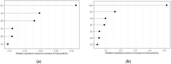 The relative importance based on an increase in node purity is shown in Figure 1. Altitude was the most important site factor influencing stand dominant height, followed by aspect and slope position. The slope, soil depth, and soil type had less influence than the first three variables (Figure 1a). The ranking results of the importance of the site factors were the same with as without the age variable (Figure 1b).