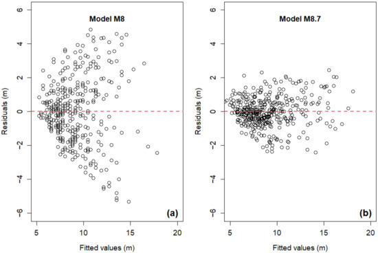The residual diagram of the optimum site index base model (M8) and its corresponding mixed-effects model (M8.7) ((a) represents M8; (b) represents M8.7).
