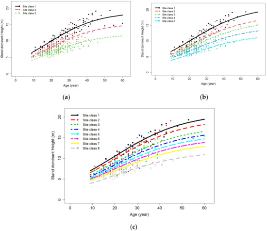 Polymorphic site index curves of larch using the mixed-effect model for different site types groups. ((a) represents M 8.7 with 3 groups; (b) represents M 8.7 with 5 groups; (c) represents M 8.7 with 8 groups).
