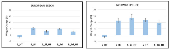 Weight changes as a result of treatments on beech (B) and spruce (S). Bi = bicine, Tri = tricine, HT = thermal modification.