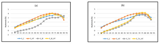 The individual sorption curves show typical patterns for sorption and desorption, though there are slight differences in the hysteresis values of samples, representing the EMC difference at a particular RH. However, as pointed out by Frederiksson and Thybring [45], care must be taken in analysing sorption hysteresis, since the common method, as in this study, depends on the determination of an absorption isotherm followed by desorption. The desorption step, based on the definition by Frederiksson and Thybring [45], is a scanning isotherm, since the isotherm has not been obtained from either a dry or water-saturated state. The hysteresis graphs, shown in Figure 3 for spruce, would seem to suggest that the treatments with bicine and tricine alone resulted in similar results. However, when thermal modification was subsequently undertaken, the hysteresis curve for S_Bi_HT closer matched that of S_HT, whereas the effect of tricine seemed to have the greater effect on the hysteresis results. Similar experiments with beech resulted in almost identical hysteresis curves for all samples related to bicine treatment, whilst for tricine alone there was a similar reduced hysteresis, but when combined with thermal treatment resulted in a curve matching those of the control and thermal treatment, respectively.