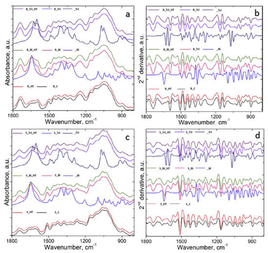 FTIR and 2nd derivative spectra of beech and spruce samples. (a) FT-IR spectra beech samples; (b) 2nd derivative spectra for beech samples; (c) FT-IR spectra spruce samples; (d) 2nd derivative spectra for spruce samples.