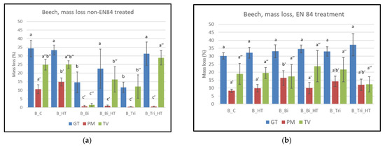 Mass loss of beech as a result of fungal decay, (a) without EN84 weathering; (b) with EN84 weathering. GT—G. trabeum, PM—P. monticola, TV—T. versicolor. Tukey analysis groups shown above each bar graph.