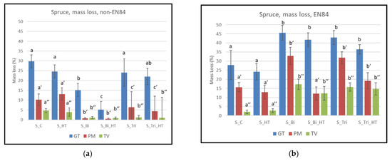 Mass loss of spruce as a result of fungal decay, (a) without EN84 weathering; (b) with EN84 weathering. GT—G. trabeum, PM—P. monticola, TV—T. versicolor. Tukey analysis groups shown above each bar graph.