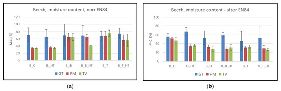 Significant differences were noted in the EMC values for samples treated with bicine and tricine, respectively, for both beech and spruce. For spruce, all samples exhibited a lower EMC than the control sample (with the exception of the samples undergoing heat treatment alone), with these values further lowered following respective heat treatments.