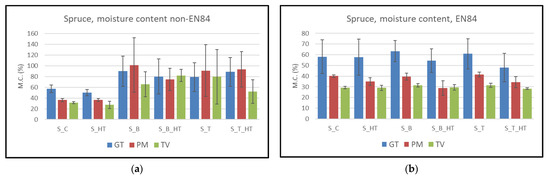 Moisture content of spruce measured during fungal decay, (a) without EN84 weathering; (b) with EN84 weathering. GT—G. trabeum, PM—P. monticola, TV—T. versicolor.