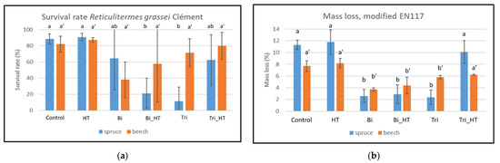 Overview of termite tests with various treatments. (a) Survival rates of Reticulitermes grassei Clément and (b) mass losses of samples following a modified EN117 experiment [42]. Tukey analysis groups shown above each bar graph.