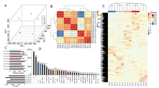 RNA sequencing generated 63.24 to 68.51 million (M) of 150 bp pair-end reads from 15 different root samples at different aluminum stress stages (C0, C1, C2, A1, and A2). After trimming the adapter and low-quality reads, the counts of clean reads ranged from 54.89 to 58.86 M, the percentages of Q30 were greater than 80%, and the percentages of mapped reads were more significant than 70% (Table S2). The three components of PCA could divide the time series groups well. Principal component analysis revealed that the samples could be clearly assigned into five groups (C0, C1, C2, A1, and A2). Furthermore, a high correlation between three biological replicates was observed (Figure 2A,B), indicating the consistency between samples was good. Figure 2E showed a heat map of a total of 41,107 different expression genes among samples and classification situations. The heat map showed that three replicates of the same sample were clustered together, and genes responded differently at different times of treatment.