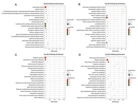 Gene enriched on different GO terms and KEGG pathway. (A) GO term enrichment analysis of the early aluminum-responsive genes. (B) GO term enrichment analysis of the late aluminum−responsive genes. (C) KEGG pathway enrichment analysis of the early aluminum−responsive genes. (D) KEGG pathway enrichment analysis of the late aluminum−responsive genes.