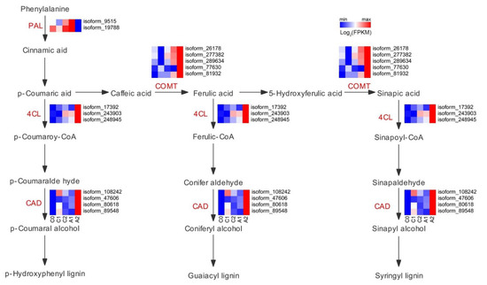 Expression of genes associated with phenylpropanoid biosynthesis. The colors scale ranging from green to red (row min to row max) indicates the expression of genes, and the expressions were presented as FPKM and normalized by log2.