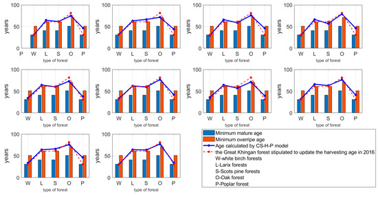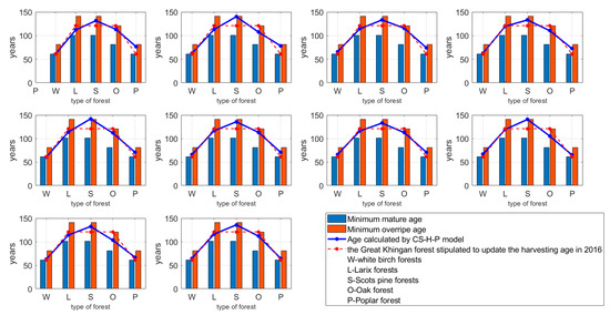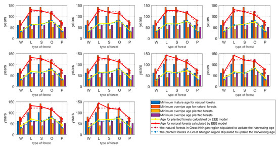 Similarly, analyzing the images of the planted forests as shown in Figure 2, among the ten simulated harvesting age results, only the regeneration cutting age calculated by poplar forests is significantly different from the established one, but it is located between the two columns, which is ecologically logical and thus the regeneration cutting age could be adopted. Comparing the ten results with higher carbon sequestration levels, the overall trend of the regeneration cutting age is consistent with the regeneration cutting age based on the forest age, with only slight fluctuations, indicating the reliability and stability of the model.