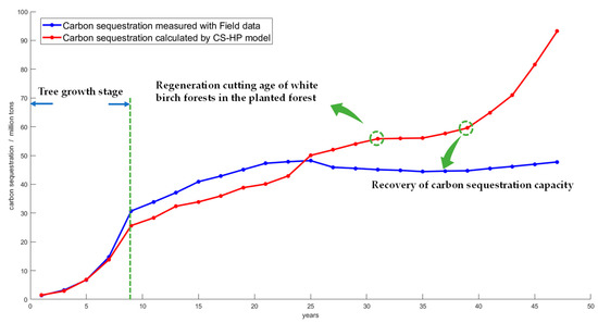 When we analyze the carbon sequestration in the Great Khingan forest in a short period of time, in order to make the simulation results more obvious, we first use the planted forests with a smaller regeneration cutting age to simulate, and then simulate the entire forest., and then calculated the carbon dioxide absorption amount of the forest every year, comparing it with the real carbon dioxide uptake of the Great Khingan forest over 48 years measured with Field data [13]. The change in the amount of carbon dioxide absorbed by the forests over time is shown in Figure 3.