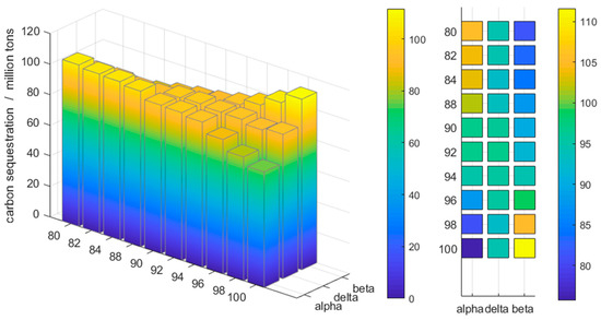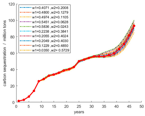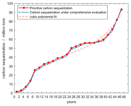 On the basis of optimizing carbon sequestration as the goal of the decision model considering the economic value and a comprehensive evaluation of the environmental quality, the carbon sequestration in 48 years was calculated as shown in Figure 5.