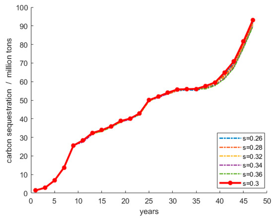 Since the loss rate of forest products in the model is an important parameter on the carbon sequestration of forest products and is difficult to determine, we performed a sensitivity analysis on the depletion rate S of forest products and verified the stability of the model accordingly. Parameters such as BEF in the model were all fixed values, and the growth rate changed accordingly with time iteration, so these parameters were not included in the sensitivity analysis.