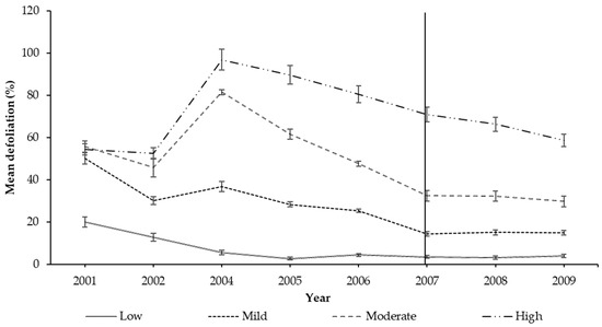 Defoliation intensity for each sample tree was assessed annually from 2002 or 2007 onwards, depending on the year of establishment, until 2010. The assessment was conducted in May or early June before the elongation of new needles occurring in this part of Finland. Each tree’s foliage was visually assessed with a precision of 10% by comparing the tree to an imaginary healthy tree with full foliage on similar sites, according to the method explained by [29]. A tree with 0% defoliation represented a healthy tree with full foliage, and a tree with 100% defoliation represented a tree without needles. Defoliation intensity varied between 0% and 100%. The year 2004 was the peak year for needle loss during the assessment period (Figure 1) (see [27]). Trees were classified into four defoliation classes based on their defoliation intensity in 2007, which was the first year for a complete assessment of all 28 plots. The four defoliation classes were categorized according to the percentage of lost needles: low (0%–10%), mild (20%–30%), moderate (40%–60%), and high (70%–100%) (Figure 1). The use of four broader classes is justified because the tree-wise defoliation level can vary between years. We excluded six trees from the analysis because the assessed defoliation intensity of these trees varied considerably between the years. Most of the assessed trees suffered from low to moderate defoliation annually. A smaller number of trees was heavily defoliated (n = 26) (Table 1). In this study, trees with 100% defoliation were still alive with a living cambium. Thus, dead trees were not included in the analyses.