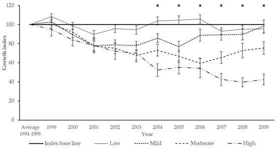 Growth indices from five pre-outbreak years. The base line (index value 100, thin black line) represents five-year (1994–1998) mean growth before the outbreak. At least two growth indices of defoliation classes were statistically significantly different (* p < 0.05) for every year from 2004 according to the Kruskall–Wallis test.