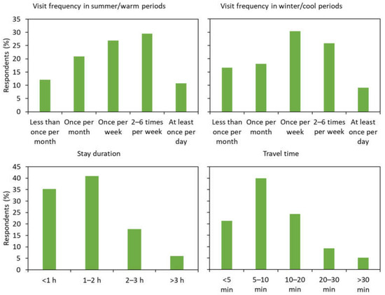 The park visit frequencies in summer-warm and winter-cool periods were similar (Figure 2). Overall, over 60% of the respondents were frequent visitors (at least once a week). Around one-tenth of the respondents visited the park daily. Most respondents spent less than 1 h (35.3%) or 1–2 h (40.9%) in the park per visit. Over 60% of the respondents took less than 10 min to travel to a park, and only 5.2% of respondents took over half an hour.