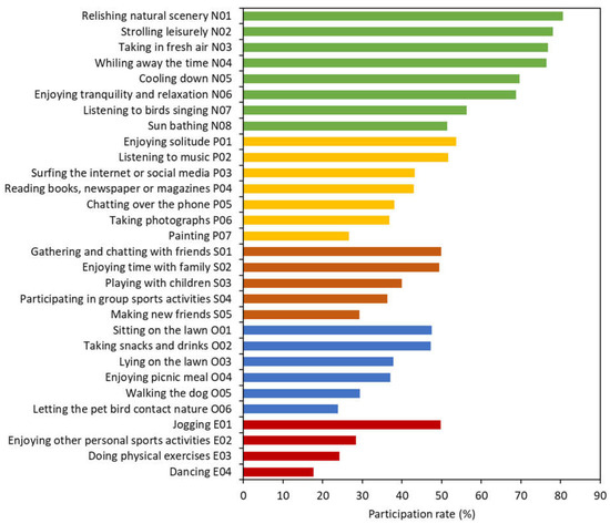 In descending sequence, the average participation rates of “nature-enjoyment cluster”, “personal cluster”, “social cluster”, “outdoor cluster”, and “physical-exercise cluster” clusters were 69.8%, 41.9%, 41.0%, 37.2%, and 30.0%, respectively. The four activity types with the highest (>75%) participation rates were subsumed under the “nature-enjoyment cluster”. They were N01 “relishing natural scenery”, N02 “strolling leisurely”, N03 “taking in fresh air”, and N04 “whiling away the time” (Figure 3). The least engaged activity types (<30%) included P07 “painting”, O05 “walking the dog”, O06 “letting the pet bird contact nature” (it is a Chinese custom to take pet birds to parks, usually daily, exposing them to the relatively more natural ambiance with greenery), S05 “making new friends”, E02 “enjoying other personal sports activities”, E03 “doing physical exercises”, and E05 “dancing”.