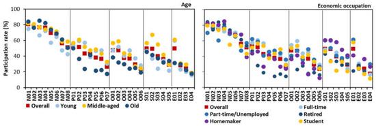 The activity patterns were markedly related to the socio-demographic factors (Table 4, Figure 4). The O-group was mainly attached to “nature-enjoyment cluster”, such as N03 “taking in fresh air”. It also had a keen interest in “social cluster” than other clusters, with the highest participation rate in S05 “making new friends” among the three age groups. On the other hand, the Y-group had the highest participation rate in “personal cluster” than other groups, such as P02 “listening to music”, and “outdoor cluster” such as O02 “taking snacks and drinks”. Meanwhile, the M-group stated relatively high participation rates for all activity clusters. E01 “jogging” was an activity type commonly engaging both the Y- and M-groups.
