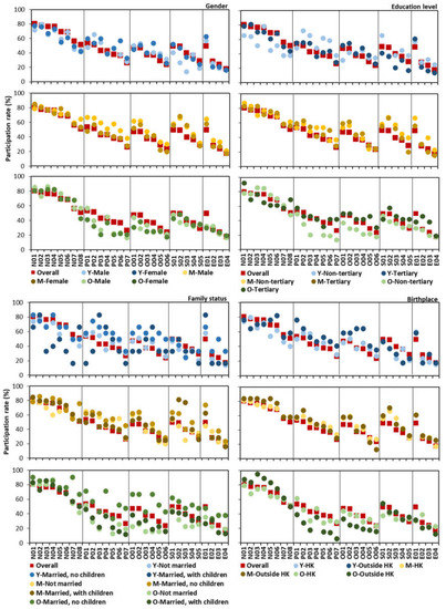 The married respondents with no children in the O-group participated more keenly than the other marital categories in all activity clusters. However, the small sample size of this category (N = 20) may create biased results. In the M-group, the respondents with children presented high participation rates in “social cluster”, notably S02 “spending time with family”, and S03 “playing with children”.