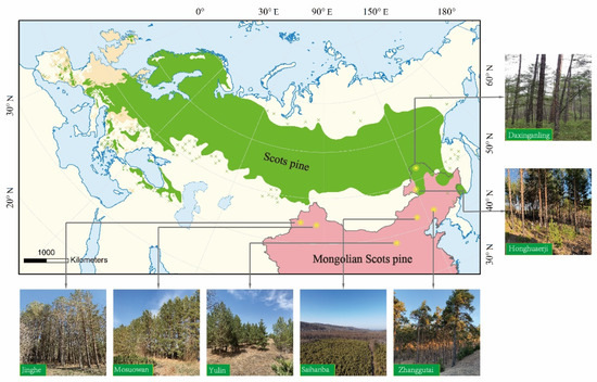 Distribution area of Scots pine (redrawn from distribution maps available in http://www.euforgen.org/species, accessed on 21 April 2022) and study sites (circles) of Mongolian Scots pine in China. Scots pine is naturally distributed in China and is named Mongolian Scots pine. The two photos to the right of the map show two kinds of natural forests: one is mountain-land-typed Mongolian Scots pine; the other is sandy-land-typed Mongolian Scots pine. The bottom five photos show five places with Mongolian Scots pine plantations in northern China. From right to left, they are Zhanggutai (in Horqin Sandy Land), Saihanba (in Otindaq Sand Land), Yulin (in Mu Us Sandy Land), Mosuowan (at the edge of Gurbantunggut Desert), and Jinghe (at the edge of alluvial gobi).
