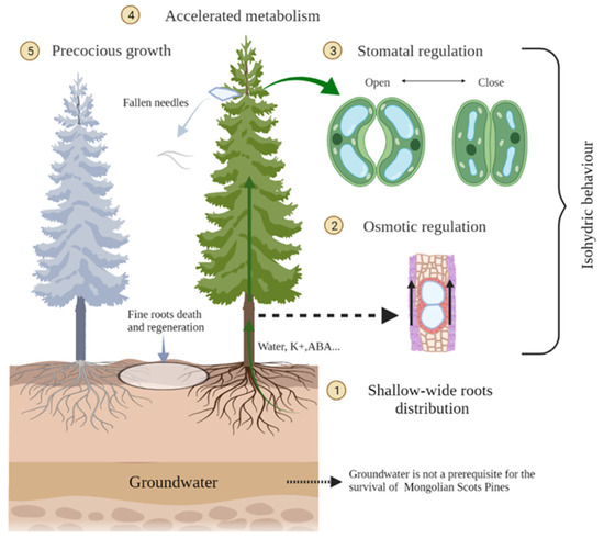 Schematic diagram showing the five key strategies behind the drought-resistance and the climate change adaptability of Mongolian Scots pine: shallow–wide root distribution, osmotic regulation, stomatal regulation, accelerated metabolism, and precocious growth. The schematic diagram was created with BioRender.com (accessed on 21 April 2022).