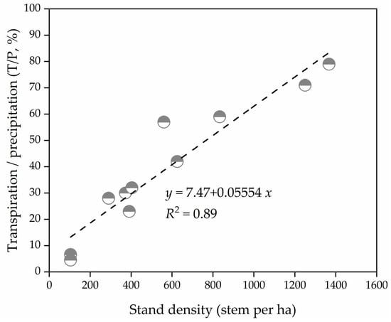 Relationship between the percentage of transpiration to annual precipitation (T/P) and the stand density of Mongolian Scots pines plantations. Data collected from reports on study sites in Horqin Sandy Land, northern China [17,66,76,97,98,99].