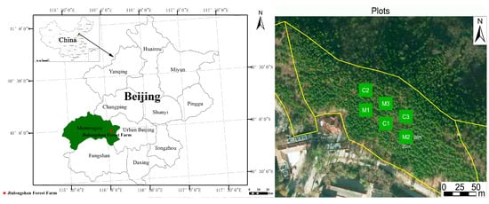 The study plots, located in Jiulongshan Forest Farm, Mentougou District, Beijing, PR China. Green squares indicate the location and size of plots, and M1-M3 and C1-C3 represent managed and control plots, respectively.