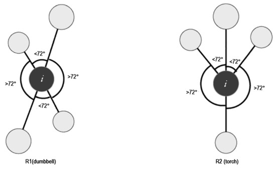 By definition, can only represent two possible types of random structural unit in terms of horizontal distribution (). Both subtypes exist simultaneously in all forests. In structural units, two angles are lower than the standard angle (), whereas the other two angles are greater. These four angles have two possible distributions [17,43]: